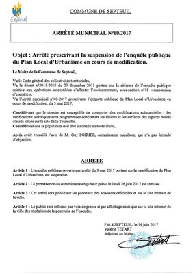 La mairie de Septeuil, Service de l'Urbanisme, vient de confirmer au cours d'un entretien téléphonique du 15 juin 2017 à 13h50 que l'Enquête Publique